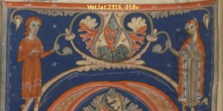 - Vat.lat.2316, the Summa Hostiensis, a legal compendium, with this late arbor affinitatis, empty of any script: Hermann Schadt (Die Darstellungen der Arbores, page 270) dates it to the 14th century. Notice how there are bands above, which seem to come from the people's knees. These are branches growing from the so-called arbor (Latin for tree). Compare how the branches are rounded into one another above, and drawn up into an X shape in a more ornate arbor of the same period in Florence, Plut.1 sin.10 (IT:FI0100_Plutei_01sin.10_0003):
