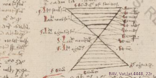 - Vat.lat.4448, Antonius de Scarparia, 14th century Italian physician, on Galen's Ars Parva, with a diagram discussed by John Murdoch's Album of Science showing the continuum by latitudes from completely well (at top) to completely sick (below):
