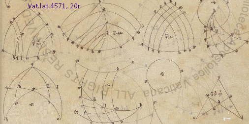 Among the codices just digitized at the Vatican Library is Vat.lat.4571, Gerard of Cremona's Latin translation from Arabic of what appears to be the lost Greek textbook on spheres by Menelaus of Alexandria. This includes several pages of very fine drawings like this, all done by see hand: