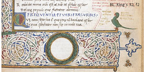 He must have been a big fellow, as he also went by the name Gigantibus. He also evidently had a thing about green parrots (I'm not making this up). Here's one that flew into his work in ms. King's 2 at the British Library:
