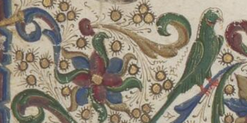 The Vatican Library has just digitized his work in a Nicholas de Lyra manuscript, and of course there is a signature green parrot in there: