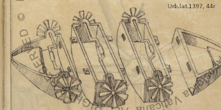 @DigitaVaticana says the artist is Siennese but otherwise anonymous. These illustrated handbooks of (easier said than done) military methods were a genre that began in late antiquity. Often the ideas were hand-me-downs from the past: rarely effective, but always delightful to dreamy inventors.