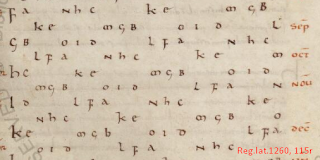 Also new in color is Reg.lat.1260, a binding of two manuscripts believed to be associated with the monastery of Fleury-sur-Loire in France (HT to @monicaMedHist for pointing this out and imaging Beccaria's description). A 10th-century manuscript includes scientific texts such as a glossary of Greek disease names (Incipit: Antrax id est rubor in superficie cutis (see eTK)). And here is its handy tabulation of phases of the moon: