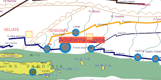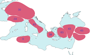If one increases the page height of the route network, one often finds a sweet spot where the layout of a whole swatch of cities fairly closely matches their pattern on a modern map. This correspondence between overlay and underlay rarely extends beyond discrete geographical areas, for example Greece or the Italian peninsula. After surveying about 60 per cent of the Tabula, I have so far found nine of these patches. This diagram of their locations around the Mediterranean Basin shows them: