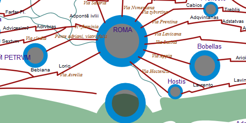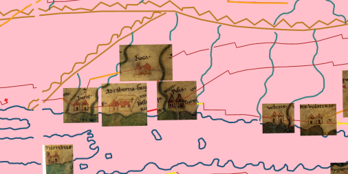 The work to create a better surrogate was detailed in an earlier blog post. I have now marked by hand on this surrogate the roads picked out by the Moovel algorithm. This overlay is a 370-KB SVG file that should open in most browsers. The trunk route northwards out of Rome to Florence has been widened to 28 pixels and there is a descending hierarchy of ramifying routes down to the smallest breadth, 2 pixels, where you can clearly see each Peutinger chicane, or zigzag marking a rest stop.