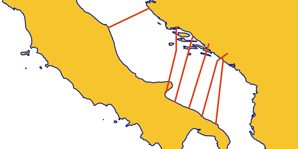 The red lines in this sketch show these matches. From northern Italy, the one match shown involves the shortest line to the closest point, whereas five cities of southern Italy are not matched to the closest towns opposite. Knowing that the Mezzogiorno has been pushed into a space on the Tabula that is not big enough for it, we can guess this (rather than the African point of view) may explain the poor correspondences.