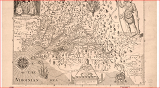 Erica Naone explores in a recent article why maps of the American colony of Virginia from 1590, 1612 and later years are drawn with west at top and the Atlantic at bottom, adopting a landwards point of view. Some of the reasons advanced by the academics Naone quotes seem a little forced. It's not to exploit the width of the sheet of paper: it's more likely that that it was once obvious that charts would naturally be drawn with the drawer's foreground at bottom.