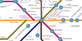 First of all, the Peutinger Diagram ostentatiously shows 12 roads that terminate at Rome, but this spider's-web presentation is a conceit. Most of these roads peter out in central Italy. The Moovel map emphasizes just one northbound (leftwards) and one southbound (rightwards) route, and a moment of reflection recalls to us that even mighty Rome itself is really no more than a stop along a peninsular trunk road.