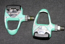 The Look-compatible pedals The Pedals that came with the bike, now detached, they are look-compatible bianchi-branded, in bianchi green |