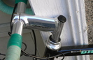 Front of the bike The Front view of the handlebars, showing the combined brake levers/shifters and the company logo |