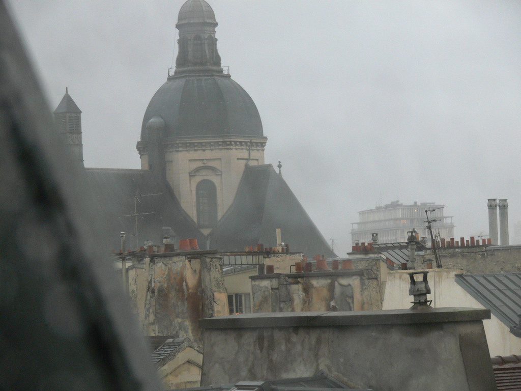 The best overall view of St. Pauls Church(R. de Rivoli) possible from the apartment porch, in the haze and rain
