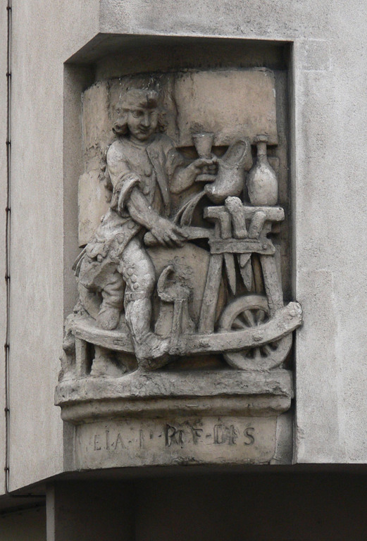 A carving inset into the corner of a modern building , of somewhat unknown meaning. It's south of R. de Rivoli, in the Marais