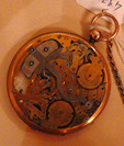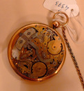 Breguet Perpetuel [Breguet] One of the oldest existant Bregueet Perpetuels, and the oldest in the collection of the Breguet Museum. It has a British style, hinged movement opens to the front, rose gold case, and damaged Pomme hands and a power-reserve indicator. aperture=f/2.8 focal=7.4mm (35mm equivalent: 35mm) exposure=0.050 s (1/20) |