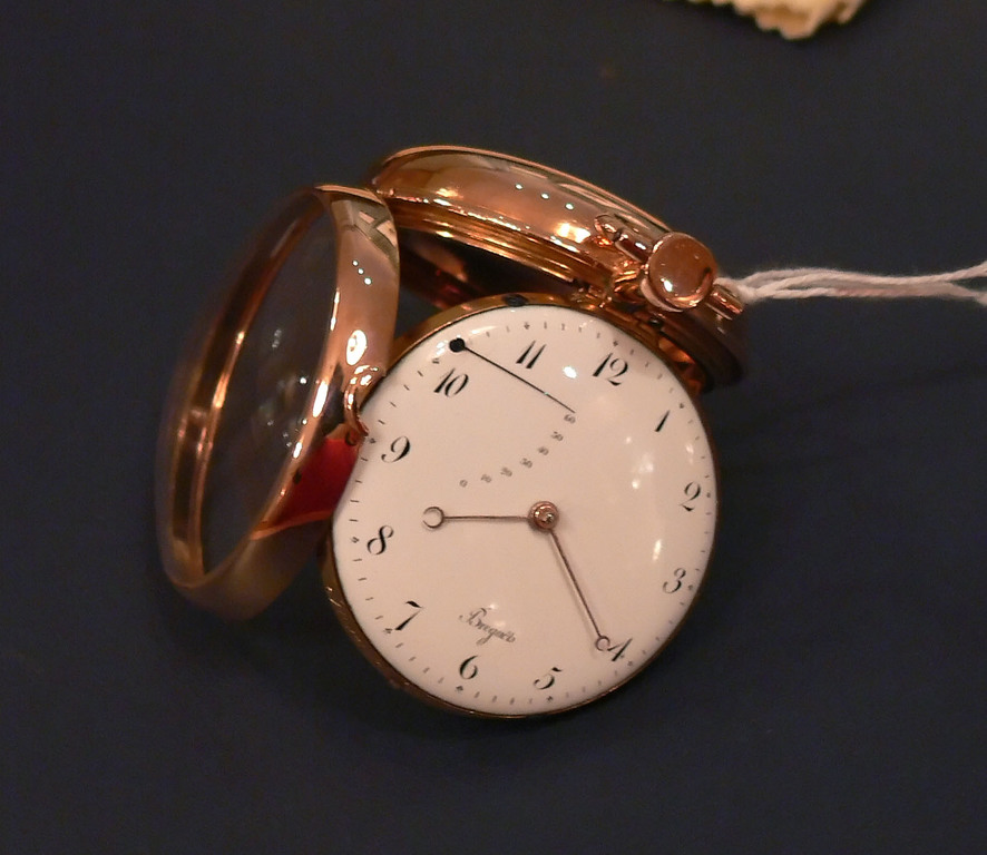 [Breguet] One of the oldest existant Bregueet Perpetuels, and the oldest in the collection of the Breguet Museum. It has a British style, hinged movement opens to the front, rose gold case, and damaged Pomme hands and a power-reserve indicator. aperture=f/2.8 focal=7.4mm (35mm equivalent: 35mm) exposure=0.050 s (1/20)