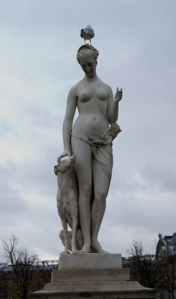 [Tuilleries] A bird on the head of a statue of Diana in the Tuilleries garden