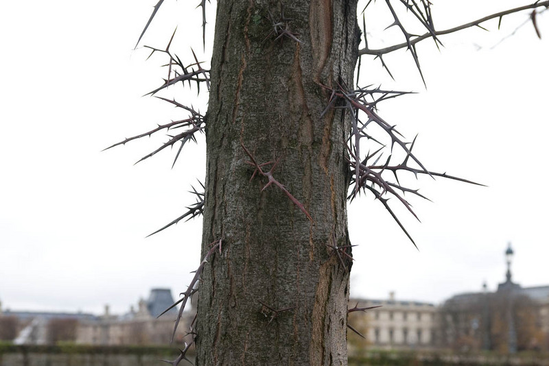 [Tuilleries] A random spikey-tree, perhaps a carob, in the Tuilleries
