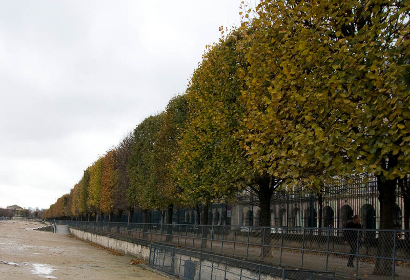 [Tuilleries] A row of identical trees changing colors at different rates, on the Rue de Rivoli side of the Tuilleries