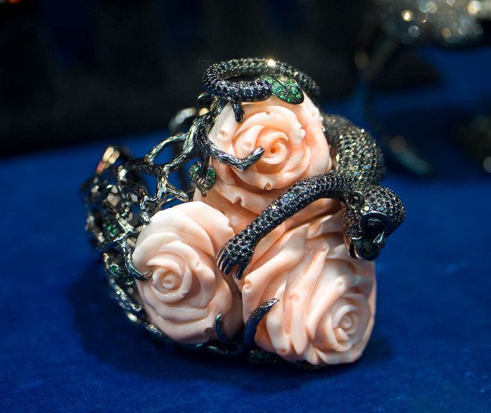 [Jewelery] a black diamond and emerald(?) monkey crawling on coral roses