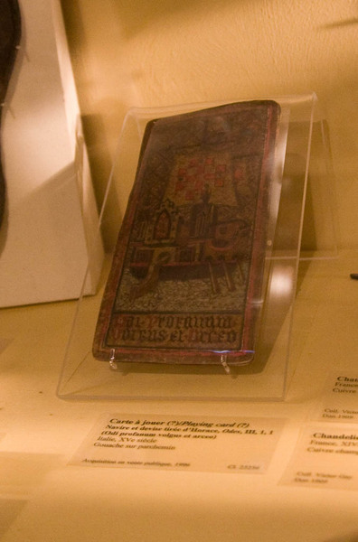 [Cluny] A 15th C Italian playing card, parchment, showing a scene from Horace's Odes, III, 1.1