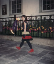 A street performer in Quebec City, August 1990, twirling fire sticks |