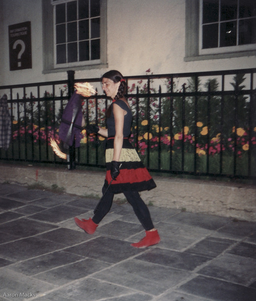 A street performer in Quebec City, August 1990, twirling fire sticks