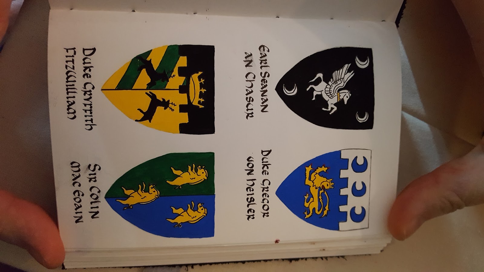 Edward and Colin (the knights of Matthias and Ken respectively) had the same team create their vigil books, so both books followed the same format: (1) what I call the "preamble" praising the one called to vigil, (2) the recipient's heraldic charge with a shield, chain, helm, and mantle, (3) the knightly lineage, (4) family/household heraldry. I tried to keep that the same for Matthias and Kennimathor as well.