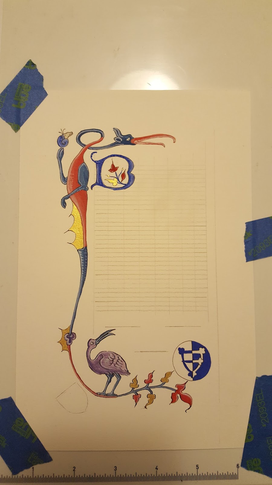 I was asked by the talented crew putting together the vigil book for Kennimathor Geirrson to help with the illuminations.  Ken (like Matthias) is of the knightly lineage of Earl Seannan an Chasur so this post has a few familiar heraldic beasties.