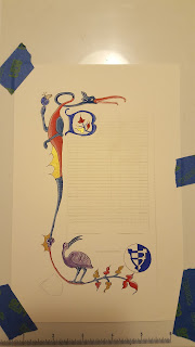 I felt like this piece has a lot of things going right for it.  The hand was light and airy enough, most of the capital letters looked correct (including most of the S capitals).  The scaling I think went fine except for the illuminated capital F which is a tad too small.  Measuring out the F to the predetermined block size went better than expected and all the guoache and shmincke gold cooperated.