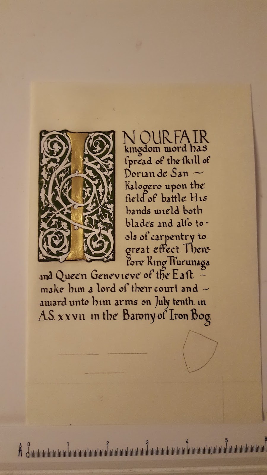 I ended up entering this piece into the A&S Defender's of Quintavia competition (theme was Quintavia colors which are white and green).  Think baronial champs, but for the Shire.  Also #3 scroll with gilding on my own.