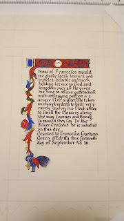 This scroll for Bianca was done as a "combat" scribal assignment at the event it was to be awarded at.  I found out this was going out last minute at the afternoon court and there was no scroll for it.  Another scroll was in the same boat as well.  Both Thyra and I had out travel scribal kits with us, but this time I happen to have blank scrolls with me as well.