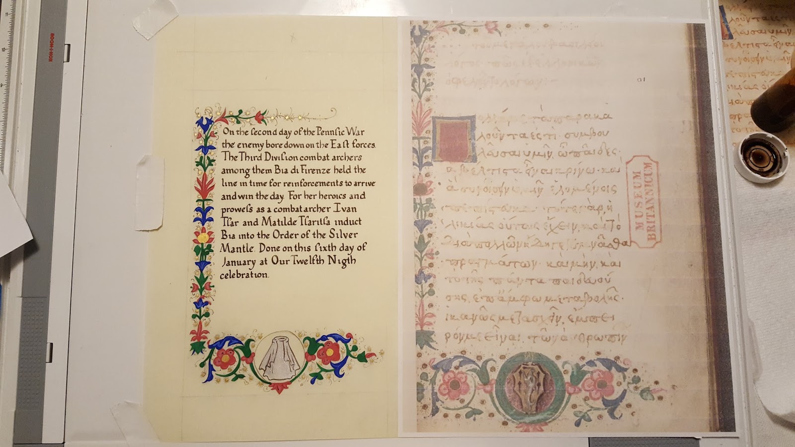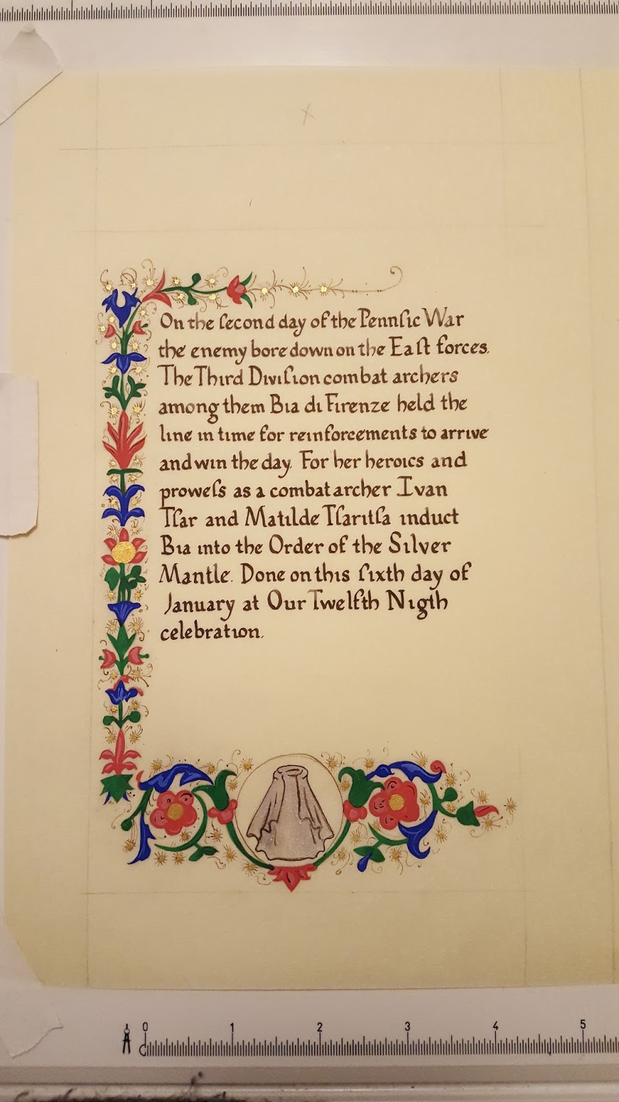 Thyra and Marieta provided commentary on my wording flow as that was my main hang up. . Thankfully the write-up had some good talking points. This is another 5x7 scroll so I tried to keep the wordiness to a minimum while being true to the deeds of the recipient.