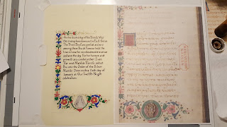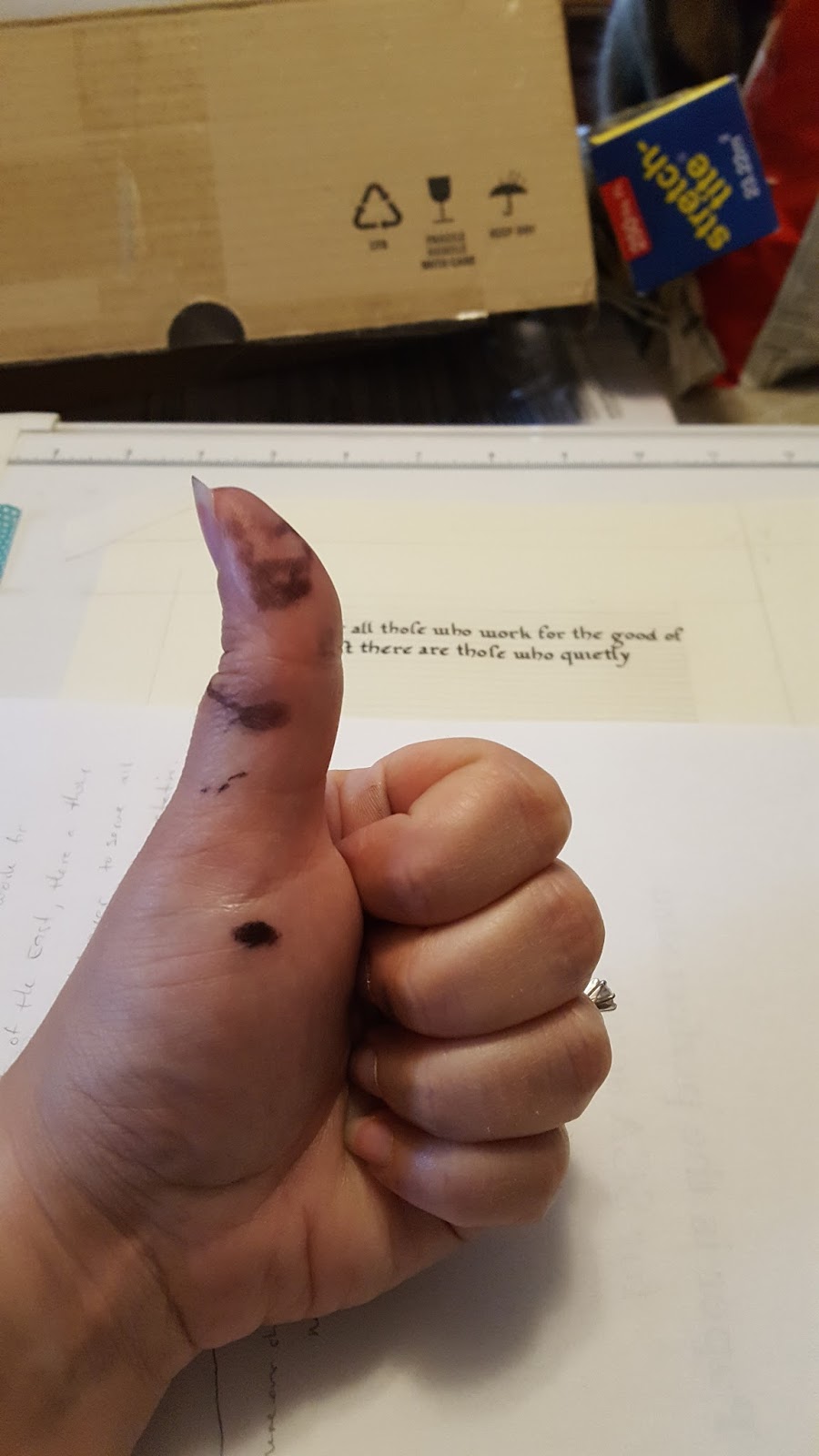 This is my first time doing this much rubrications (aka pen doodles). Thyra lent me some of her stash of walnut ink to get the right look of the brown designs.