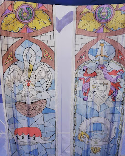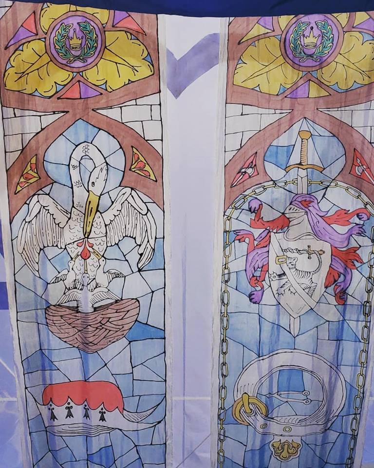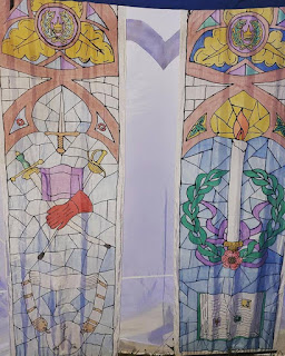By the time I joined the painting party, all the resist work was done so I just "colored inside the lines" as it were.  I helped with the Chivalry, Pelican, and Defense banners along with the Rose window.