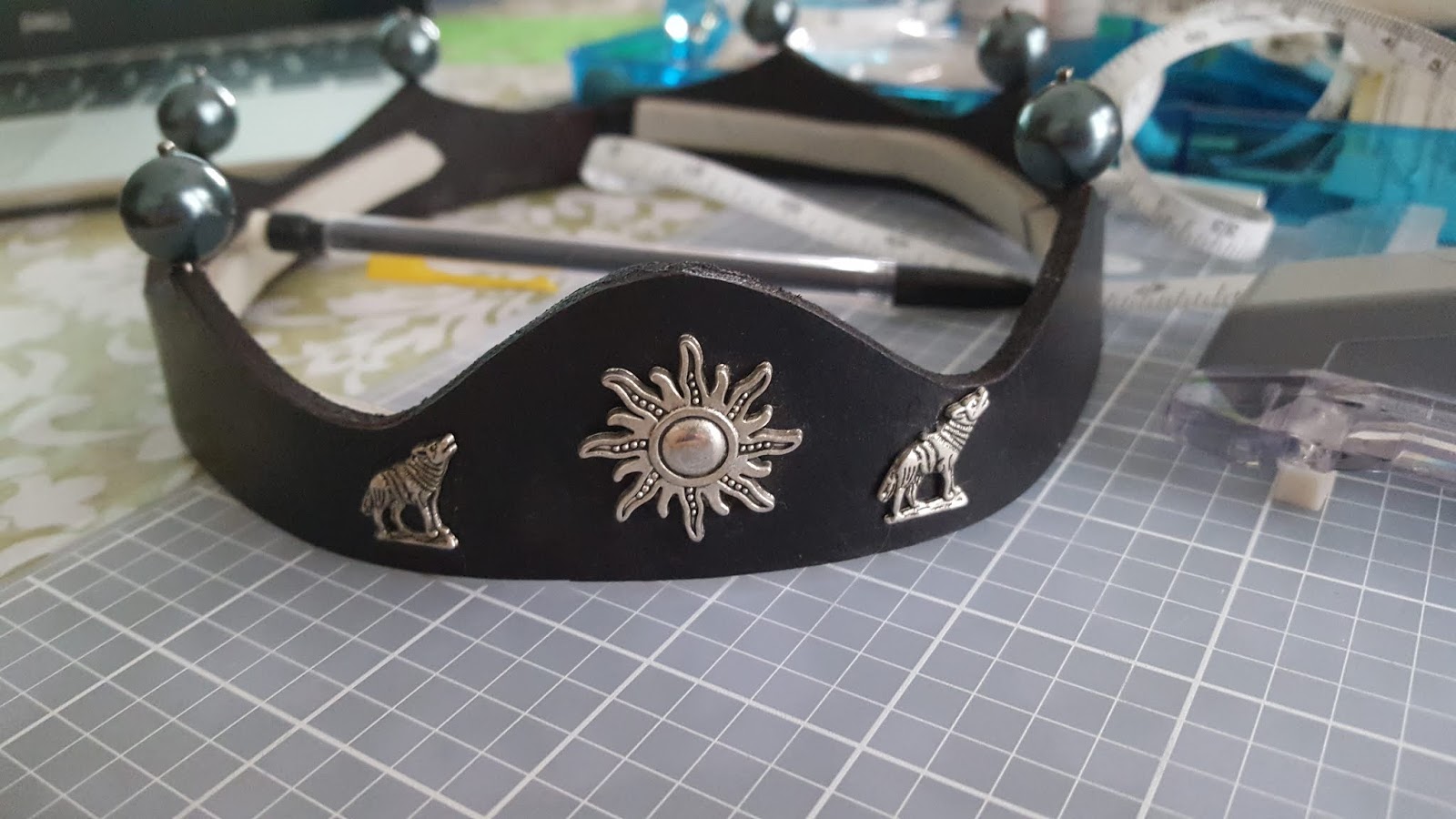 Long story short, I took on a commission to make a coronet who was to be honored with  Court Barony.  Thomas of Effingham put up with me asking a ton of questions about his idea/mock up until I had a running idea of what I could/could not do in a tight 3 week turn around.  I say a tight turn around because I was also making LARP props for myself due the same weekend and I also lost a few days of crafting due to new parent fun-times (because babies....seriously.  No regard for deadlines).