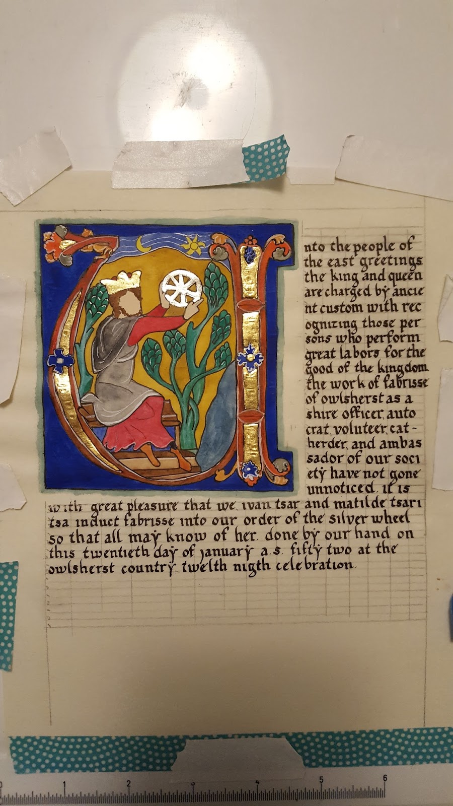 This was scroll #2 due in a six week period.  Marieta happened to have a lovely blank set aside for "the next time a Silver Wheel gets assigned" and I asked to yoink it for this assignment.