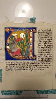 I spent most of my prep time learning the hand that goes with this illumination which is proto-gothic.  My trusty "Calligrapher's Bible" happened to have a decent proto gothic miniscule ductus to base the text off of.  Based off the small snippet of source material I had, it looked to be a pretty close match.   I did find the lack of capital letters for any sort of proto-gothic in my books a little concerning and I'll try to remedy this in the future.