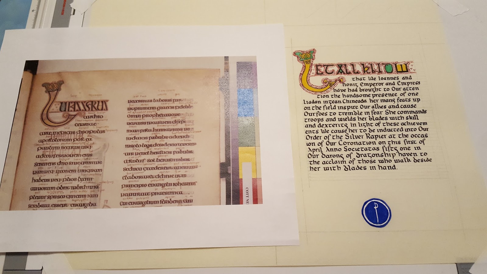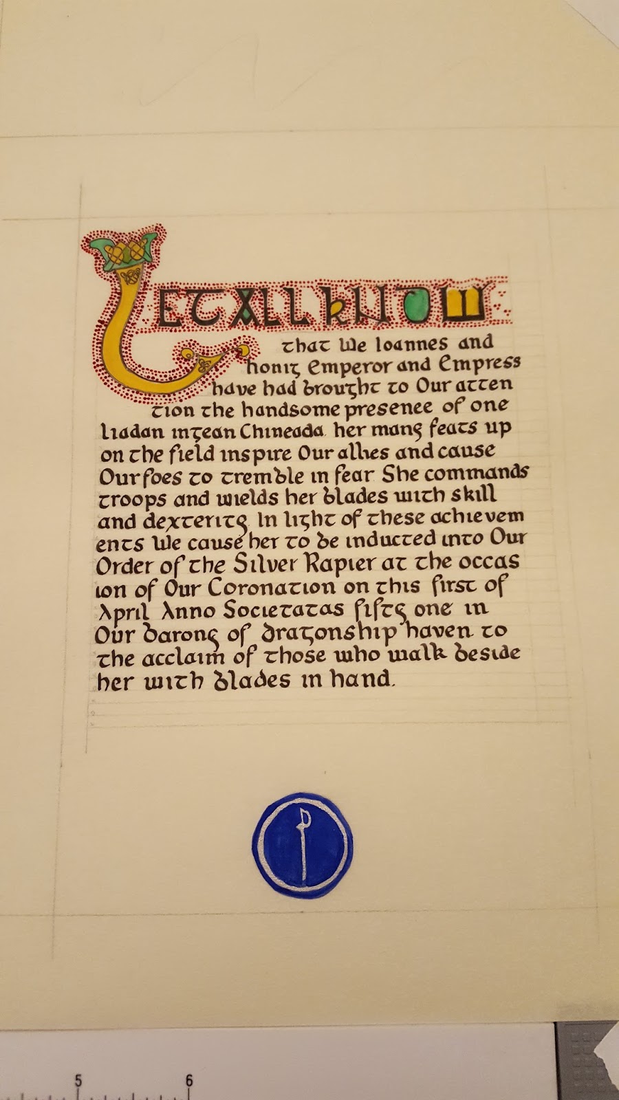This is my first Silver Mantle which was going to one person in a squad of combat archers up north.  The first thing that struck me on this was the recipient's name.  Woooo!  I get to do another Italian scroll!  I went looking for a new source and found one that was pretty neat and I happened to really like the color scheme on this one.  Since the source had a Hebrew script, I opted for my trusty Humanist hand for this scroll to match the time/place of the scroll.