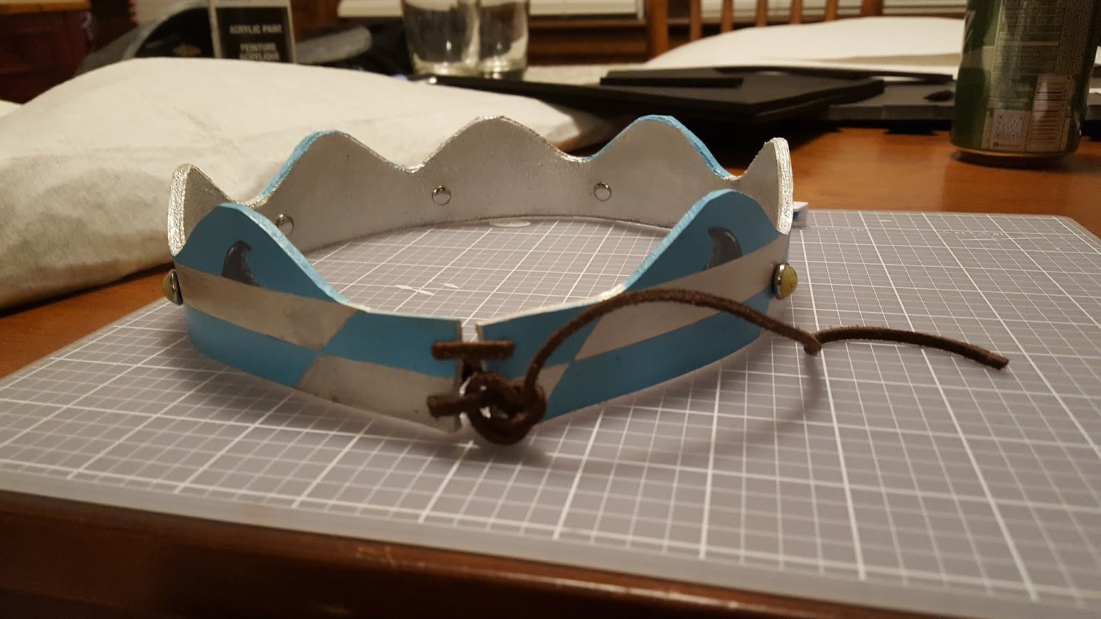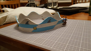 General layout was going to be a"wave" patterned coronet with seven waves along the top and six pearls inset between the waves on the band itself.  I used my own baronial coronet (shown below) as a template for the wave.  Obviously my coronet is a little bit "daintier" in terms of band thickness, but I only used it for shaping.  The band length was done to I believe 23 inches with an open back since I didn't have exact head circumference.  I split the difference in circumference between my coronet (tiny noggin) and my husband's coronet (bigger noggin).