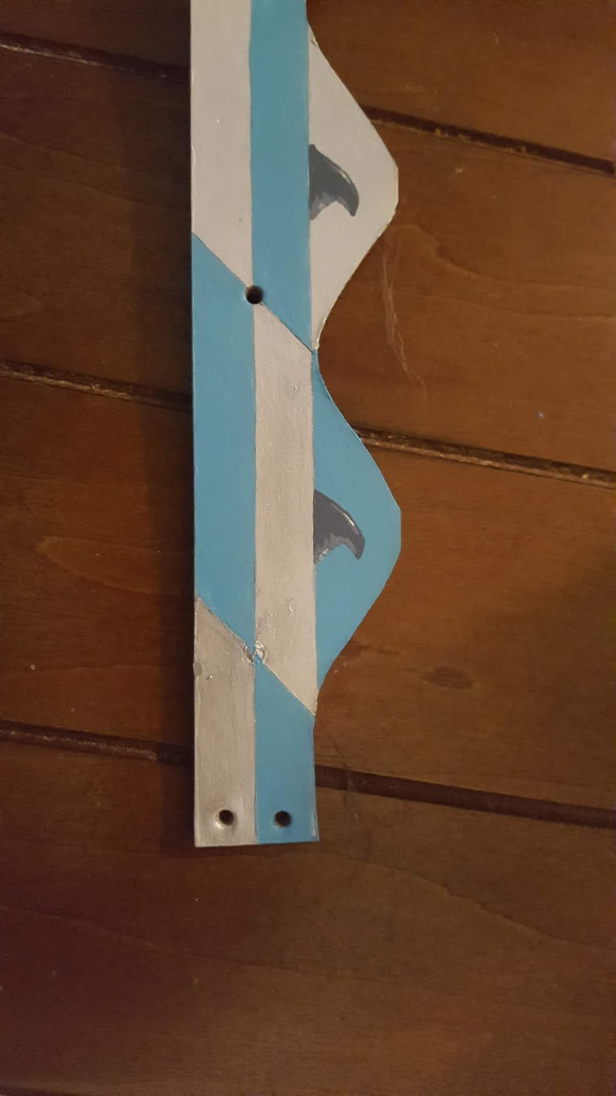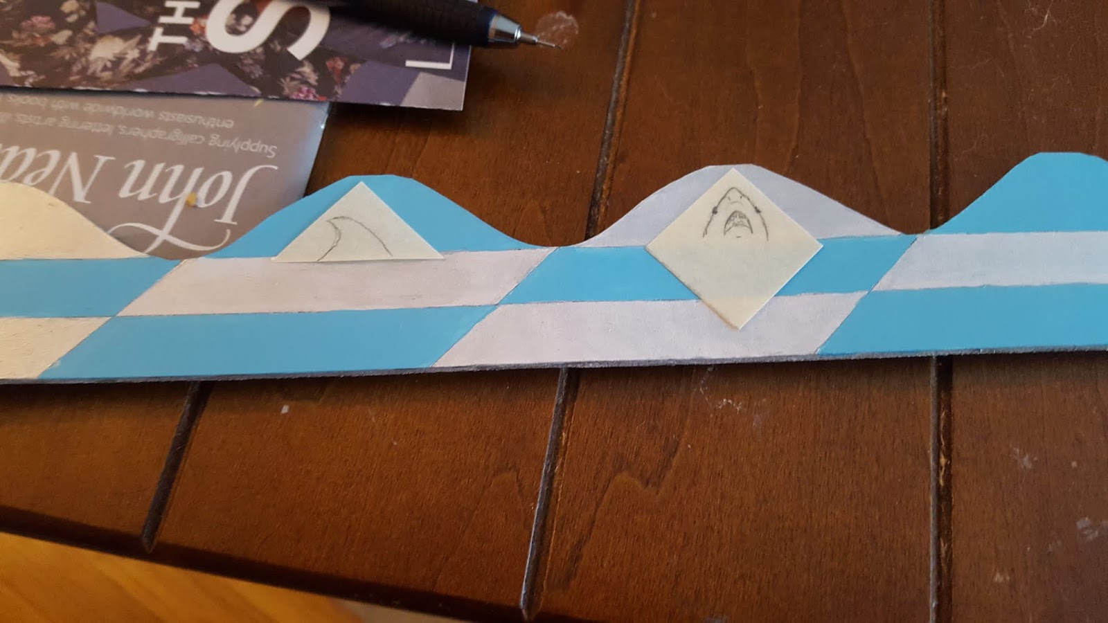 Next was the sharks!  I did some freehand sketches/mock-ups to see how they would look first.  Shark fins point inward to the center "Jaws" shark.