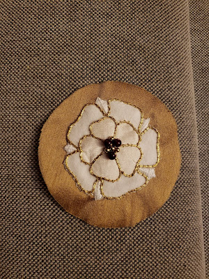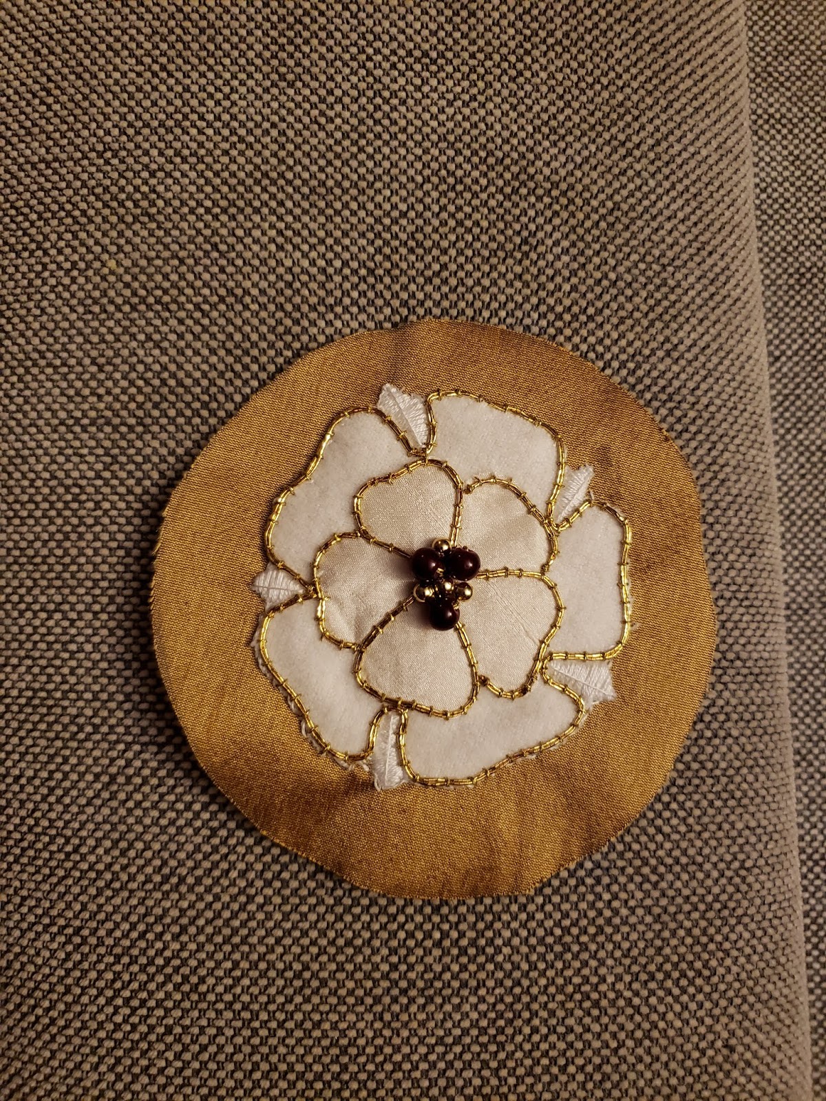 The rose is silk and wool with all gold work done by couching. I did a double strand of gold to outline the petals and spent the better part of two evenings trying to remember what I was doing. This was the second gold work piece I've done and I think it came out rather well.