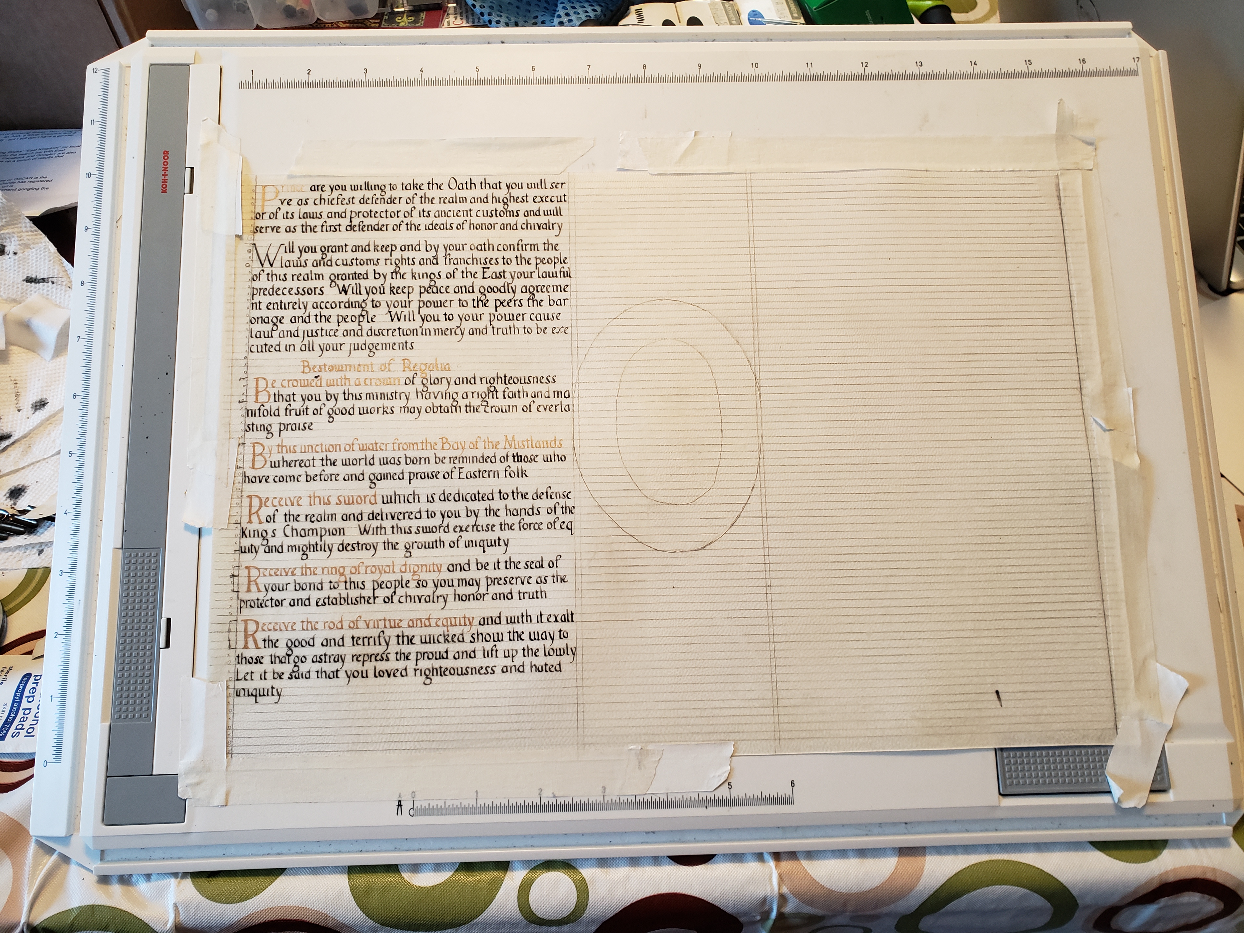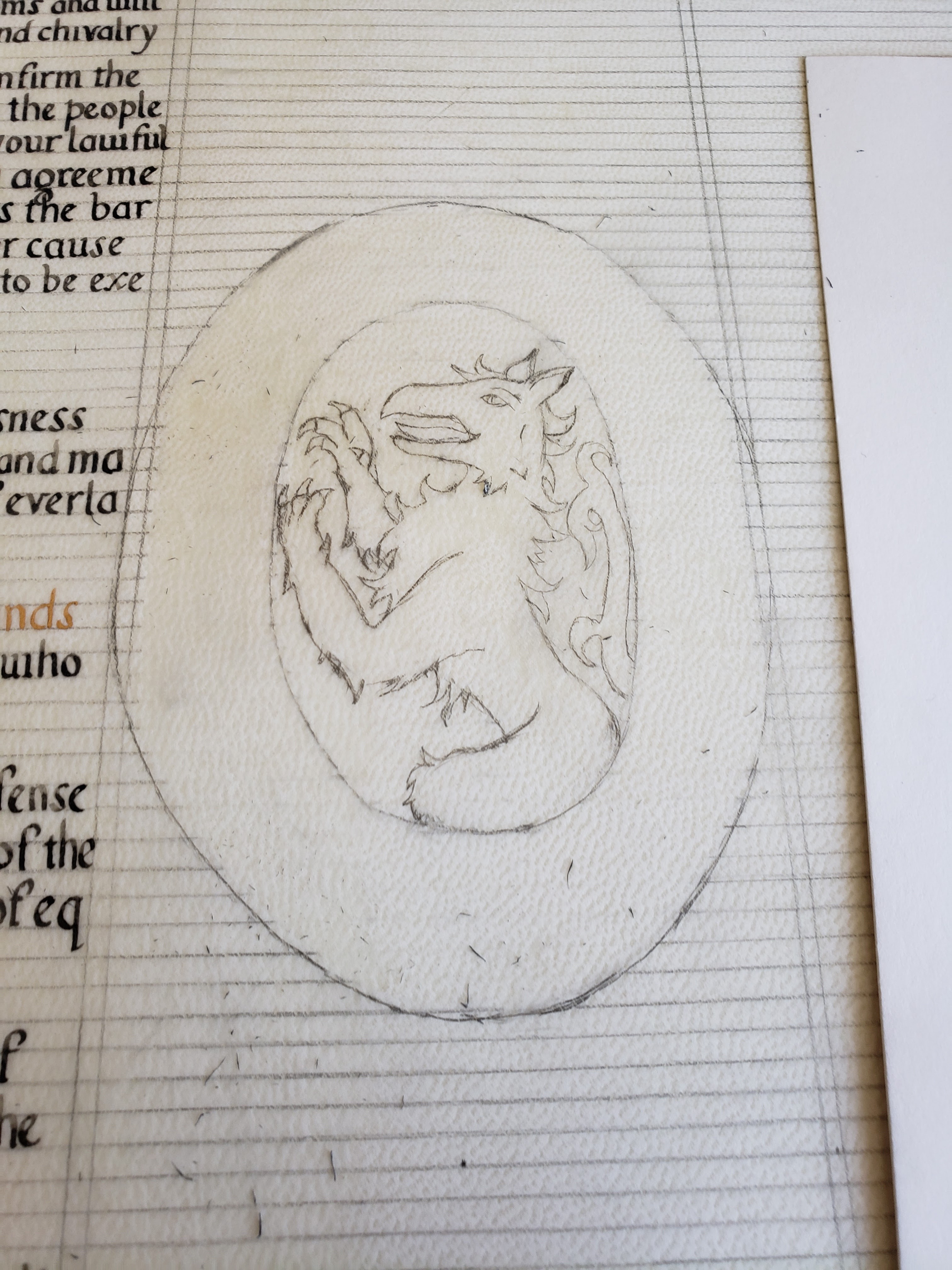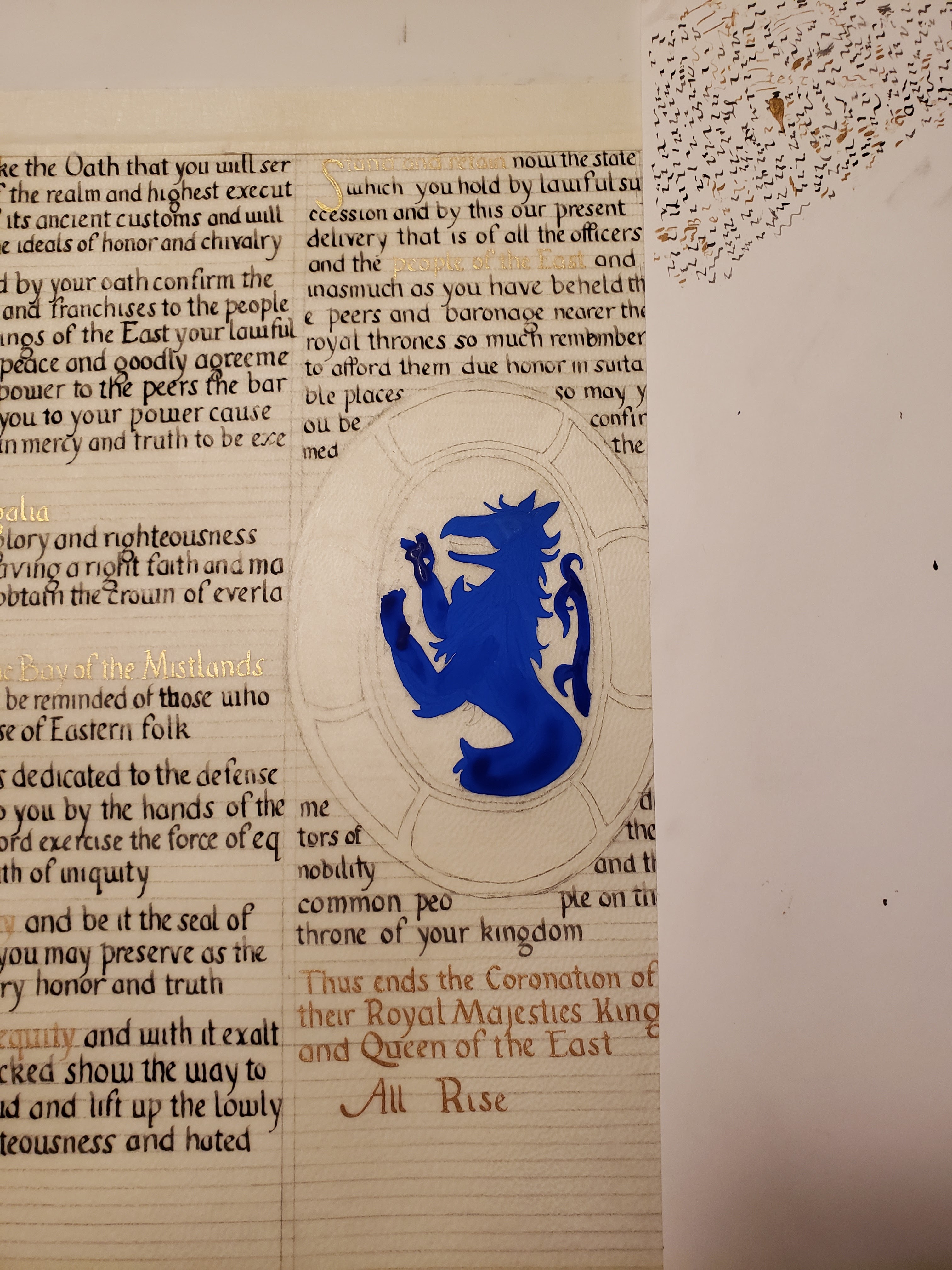 Calligraphy was done on the hair side of the parchment on the advice provided from Mistress Eva. I did two rounds of preparation on the parchment. The first was a full rubbing of pumice all over the parchment. The second was a light dusting of pumice after the lines were laid in pencil. I was careful to gently brush the pumice off the parchment as I didn’t want to accidently smudge or erase the pencil. After starting the calligraphy, my #6 nib bent after a paragraph of calligraphy. After borrowing another nib from a fellow scribe, I ordered 10 additional nibs in case this happened again.