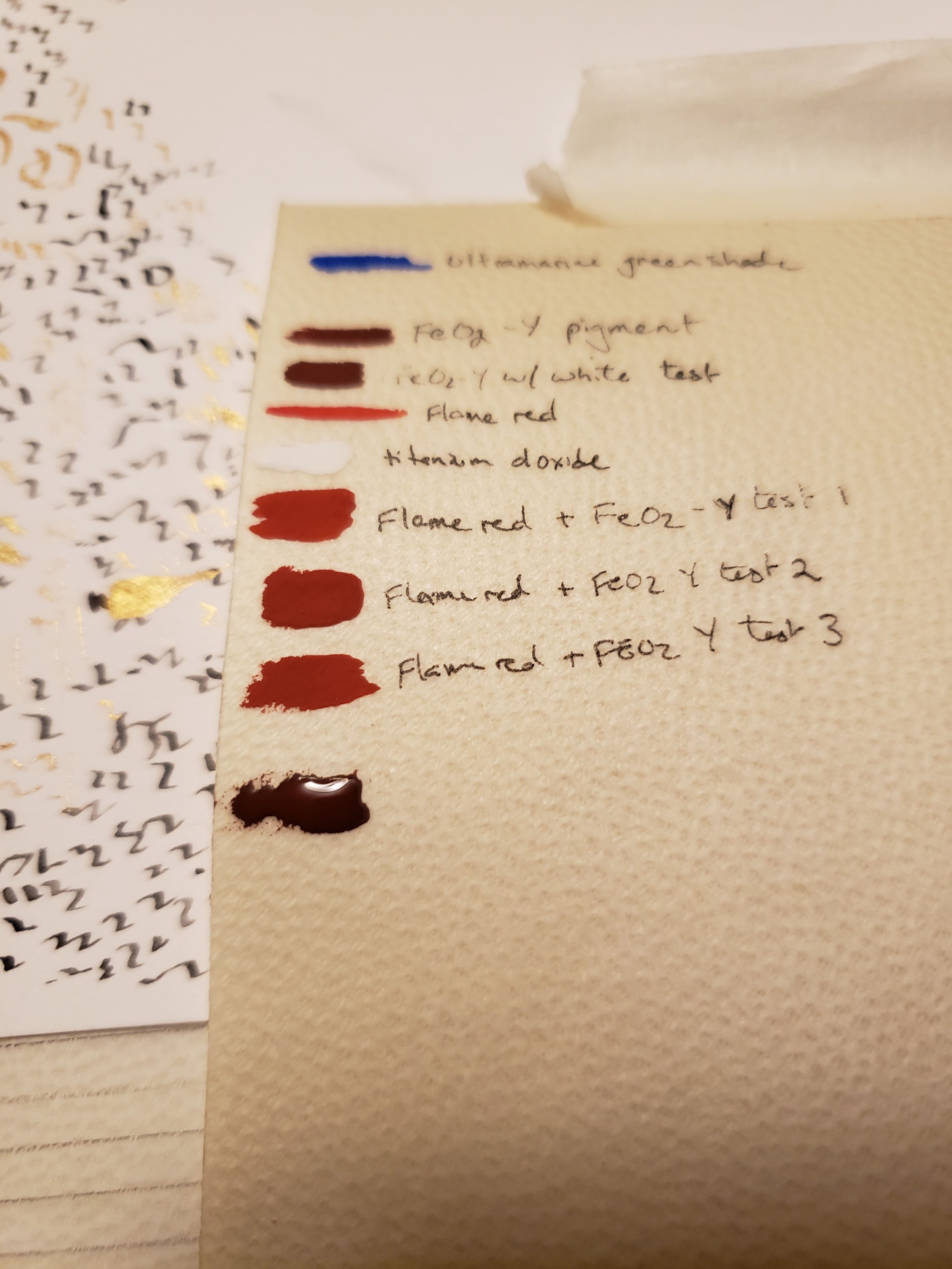 My choice to use non-toxic gouache (and iron oxide) rather than period pigments (either commercially available or prepared by hand) was for mammalian safety. I have two very inquisitive tortoiseshell cats and a child under the age of two who all love to get into EVERYTHING they are not supposed to. I cannot guarantee against cross contamination of the non-toxic materials with toxic pigments. This is also why I used a modern nib and stylus rather than cut quills from reeds or feathers. Anything that could be confused for a cat toy, be dangerous for accidental ingestion, or be easily damaged was substituted for a safer (and less enticing) option.