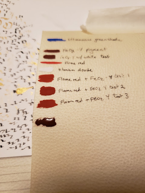 Before moving on to the rest of the colors, I did some text swatches on my piece of practice parchment.  There were a few iterations of the red color as I was trying to find a balance between earthy red and well...brown.