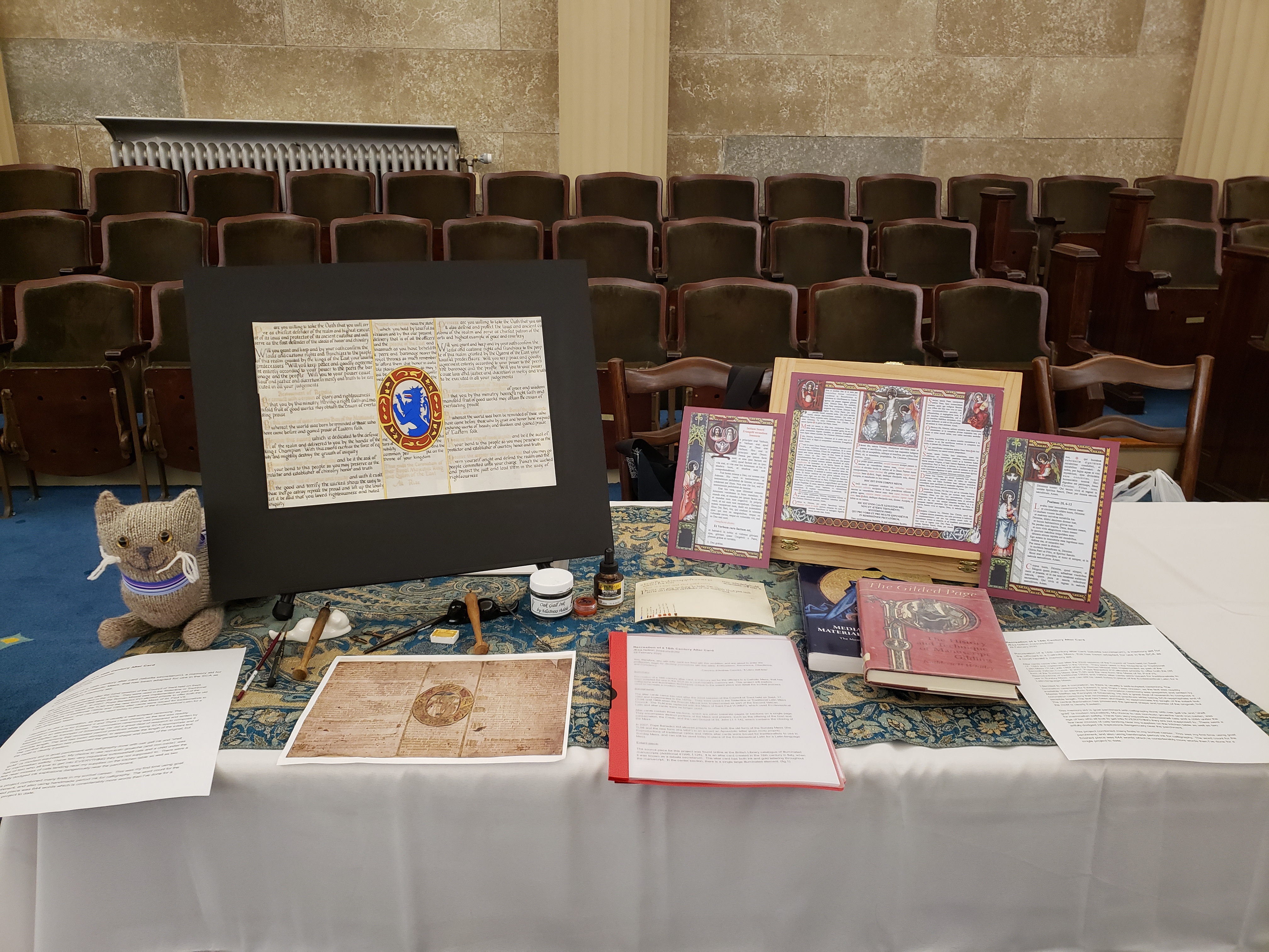 My lack of dedicated scribal space made for a few interesting challenges. There were a few near misses of cats landing near my supplies on the kitchen table as well as two artfully dodged ink explosions dangerously near the parchment. After each calligraphy or illumination session, my entire set up had to be taken down for the project’s own safety. I wasted a lot of time getting set up each session which could have been used for other tasks.