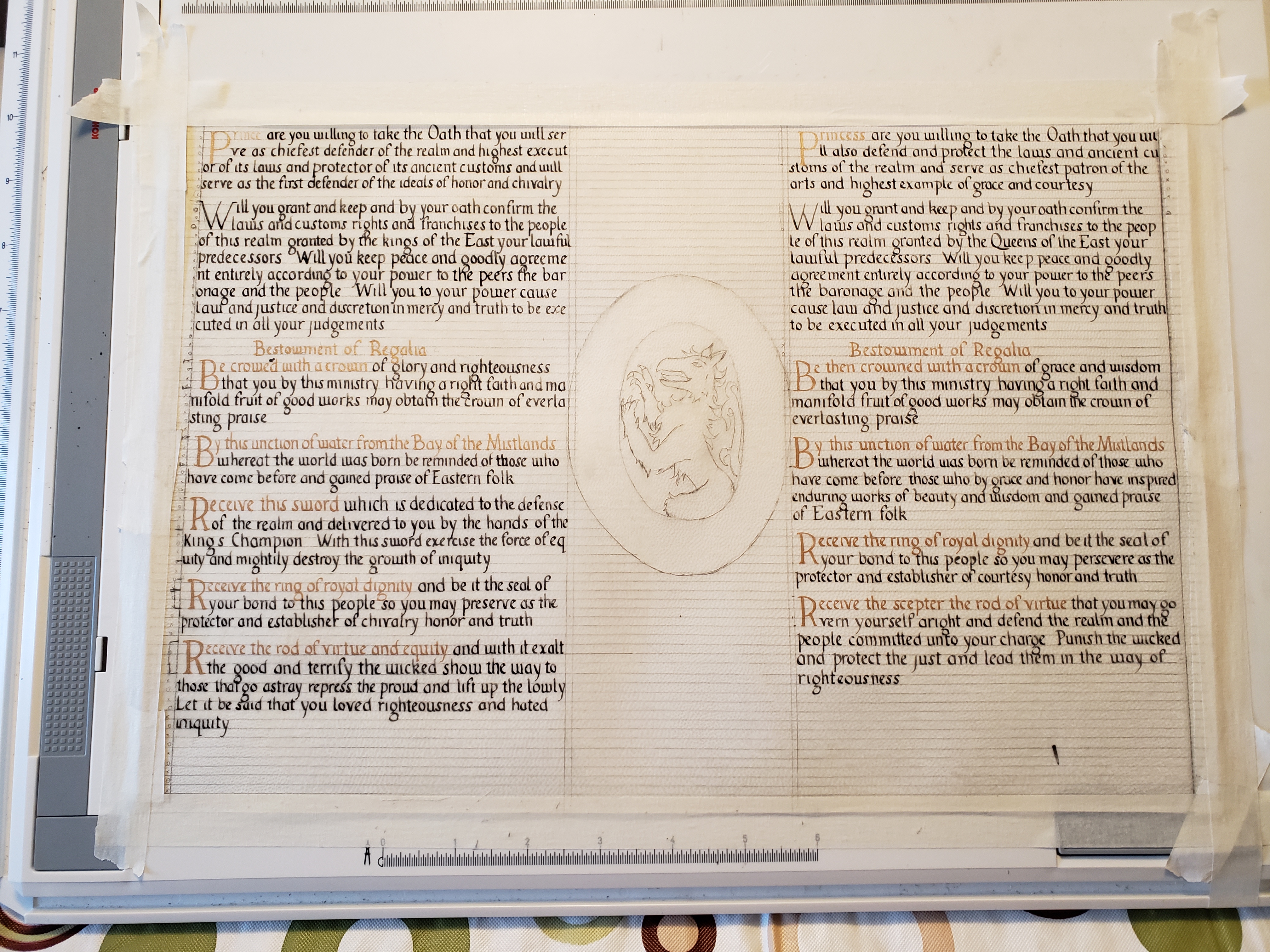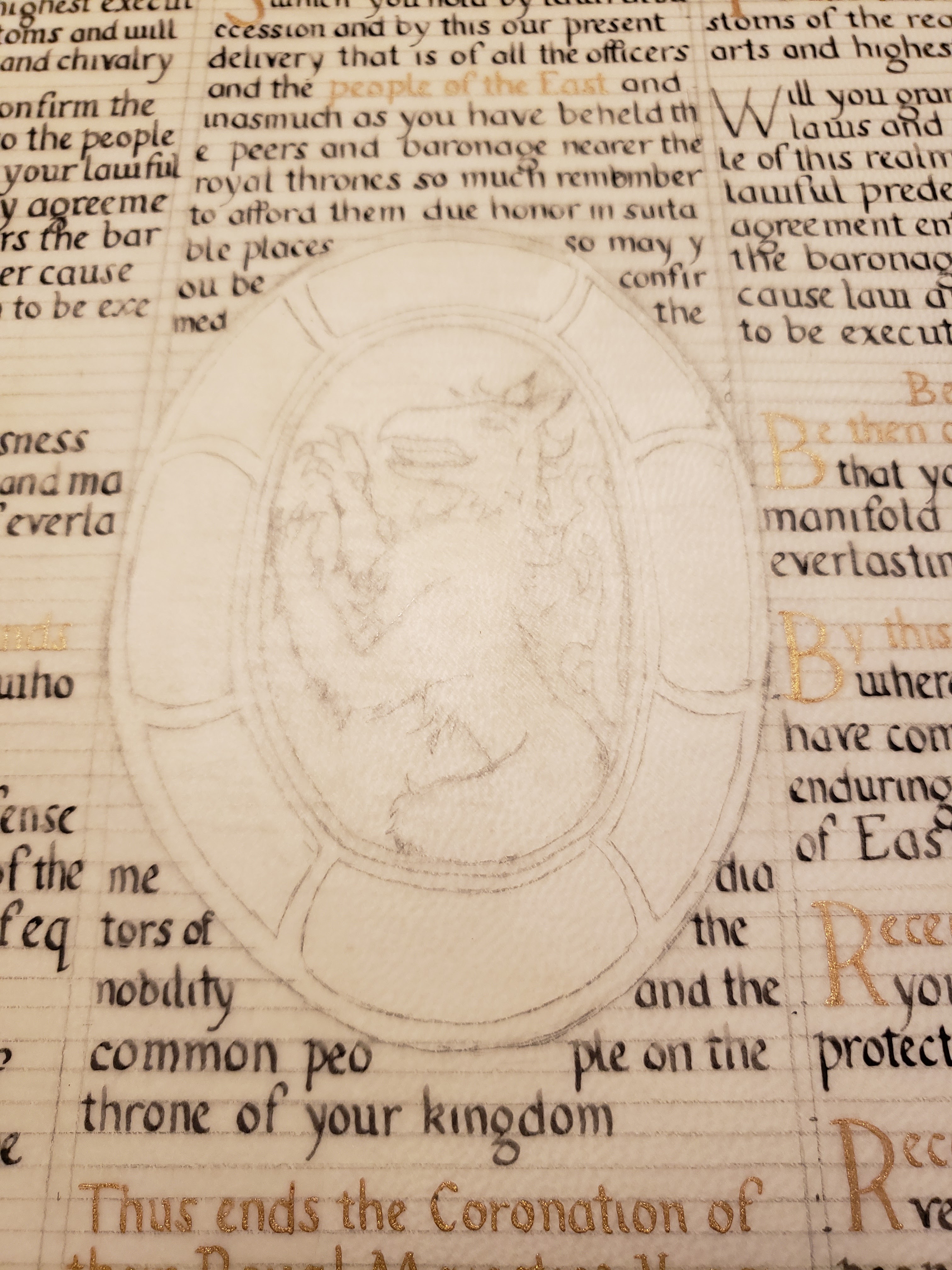 I wanted to remain close to the original layout.  In editing down the coronation text, the ceremony for the sovereign and consort line up pretty well leaving the center text space for a "benediction" or in this case the end of the coronation ceremony.