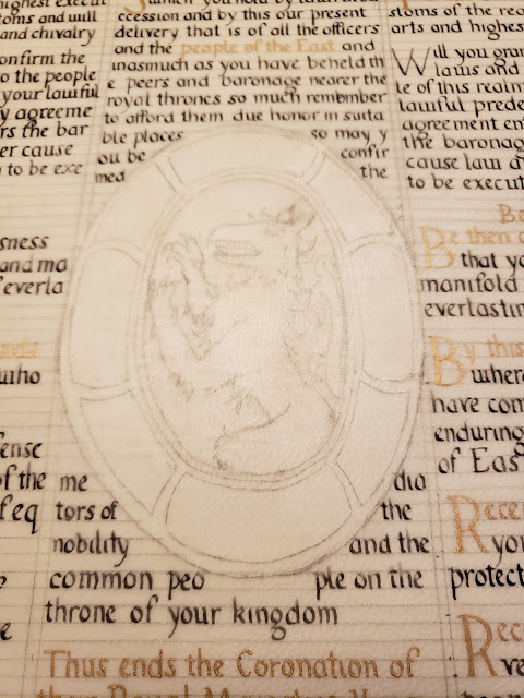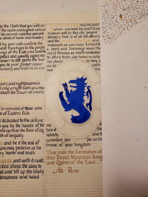 But wait...there's more!  I decided this needed a scroll for the royals to sign the week before it was due (in between another scroll project and silk banner painting).