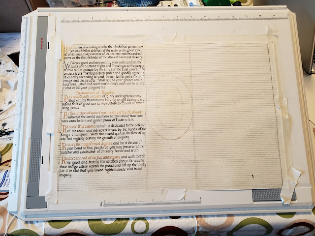 First thing's first.  In trying to recreate this piece, I had to get down to business with my least favorite part of the scribal process: arithmetic.  For scaling this piece, there was a balance of what would work for the amount of words I had and how large of a piece of parchment I would need.  With the assistance of Thyra, we settled on 1.2x scale of the original and have a boat load of notes on how we scaled it.  You can see a mix of my handwriting and Thyra's on this.  We both apparently have tiny handwriting.