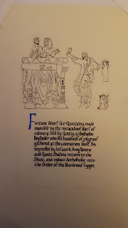 The award was for a Burdened Tyger for their Majesties' Coronation which was a period Anglo-Saxon affair in terms of food (and holy cow was it delicious!!). Gunðormr was gracious enough to find a very interesting source...but it was mostly pen and ink drawings. Something I've never done on a scroll before. I was gently encouraged by my friendly neighborhood Duchess to just do it since it was technically one step less than a regular illumination. With arguments like that....