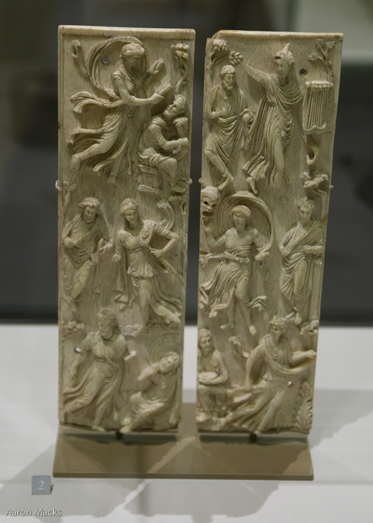 These 2 plaques present, on three registers, the six muses with their attributes; accompanied by men of the sciences and the arts who they inspired, but their identification is uncertian