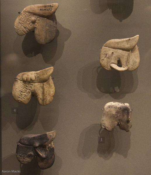 These inscribed models are part of a cache of 32 livers discovered in room 108 of the Palace. The liver was considered in Mesopotamia the essential organ for the thought and the feelings. The examination of entrails of a sheep or a kid was used to predict the future. Malformation or anomolies of the liver were reproduced in clay and the prediction was inscribed. These copies of the livers served as a reference for the priests and demonstration pieces for students